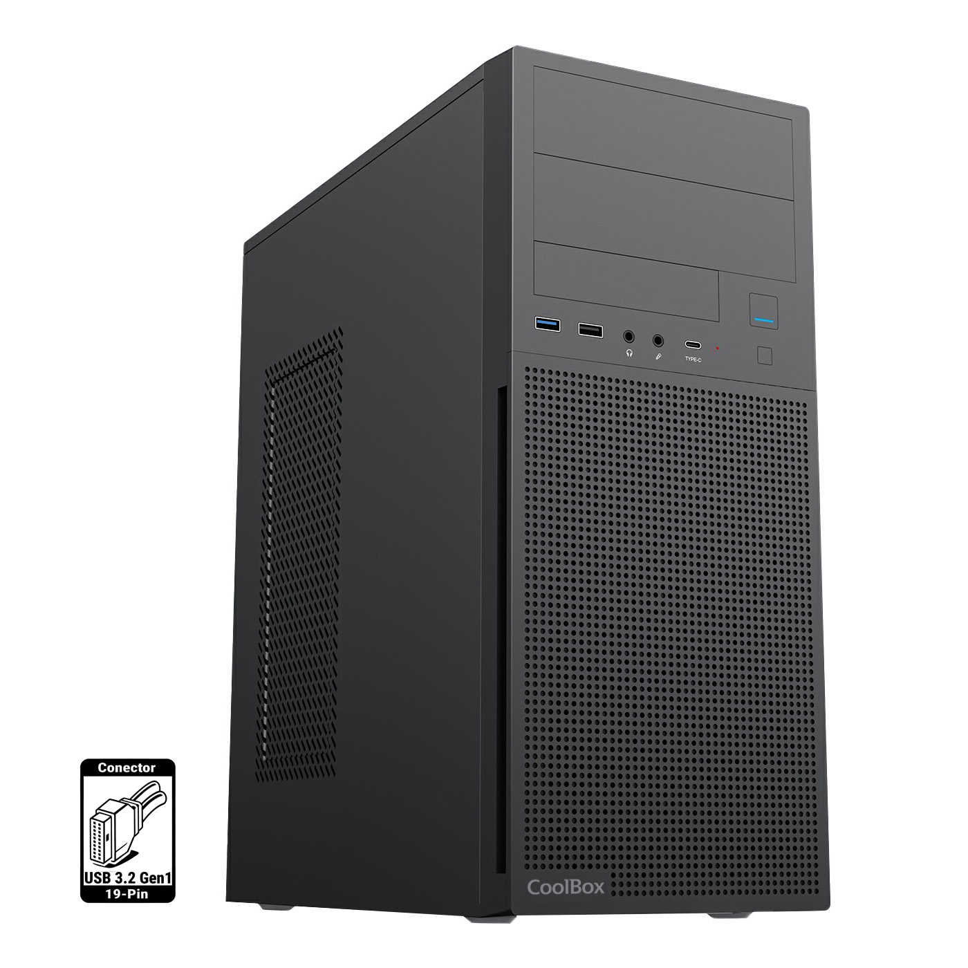 ATX / Cooler CPU 140/mm / 3×SSD + 1×HDD / USBC + USB 3.0 + USB 2.0 / fuente 500w