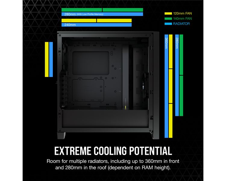 El espacioso interior puede alojar un máximo de 6 ventiladores de 120 mm o 4 de 140 mm, así como varios radiadores, como uno de 360 mm en la parte frontal y uno de 280 mm en la parte superior.