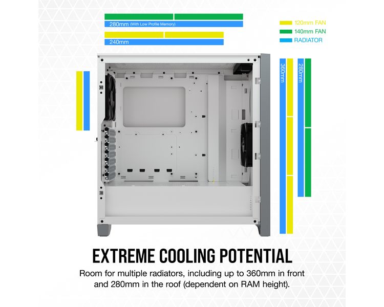 El espacioso interior puede alojar un máximo de 6 ventiladores de 120 mm o 4 de 140 mm, así como varios radiadores, como uno de 360 mm en la parte frontal y uno de 280 mm en la parte superior.